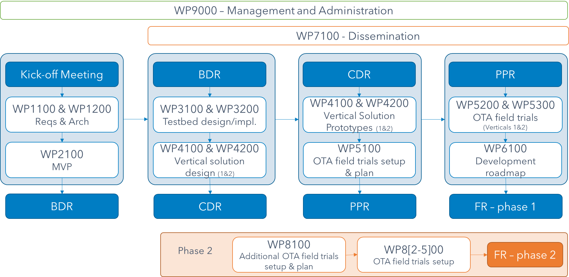 The first 5G-HOSTS-SAT phase has a workplan structured in four milestones. The baseline design (6 months) includes use cases, architecture and technical requirements definition, with MVP specification for smart agriculture and PPDR services. This is followed by design and implementation of 5G-HOSTS-SAT testbeds, planned for the CDR (month 11). The implementation of two vertical solutions with OTA field trials setup leads to the PPR at month 16. The final step covers field trials execution, results analysis and development roadmap definition, with final review at month 21. The second phase brings additional verticals in PPDR, media, transport and logistic.