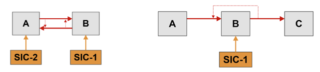 Architecture 2 comprises three communication nodes (nodes A, B and C), where communication links A-B and B-C operate at the same frequency and, thus, self-interference cancellation (SIC) is required only at node B.