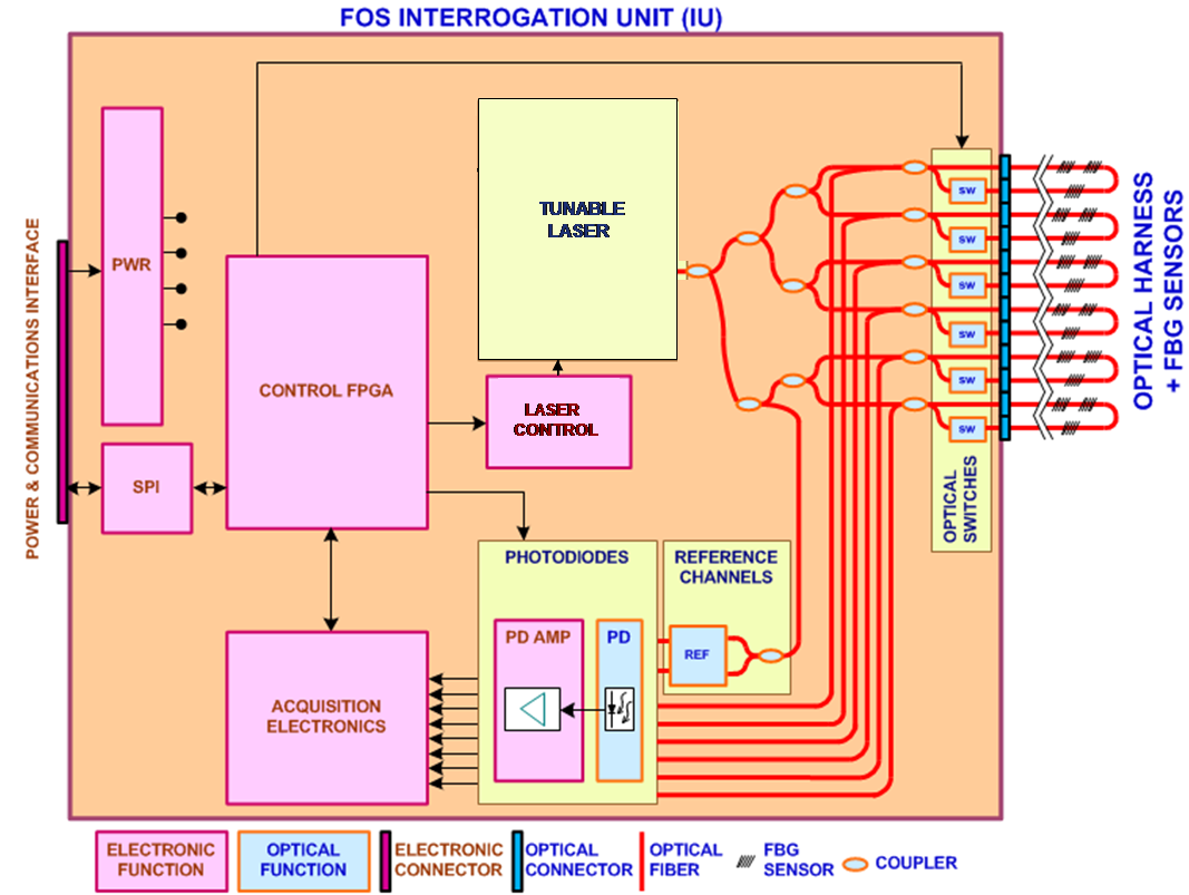 • FPGA: it embeds the TM/TC management of the module, the interface with the serial communication bus and a micro-processor that is used to measure the reflected wavelengths