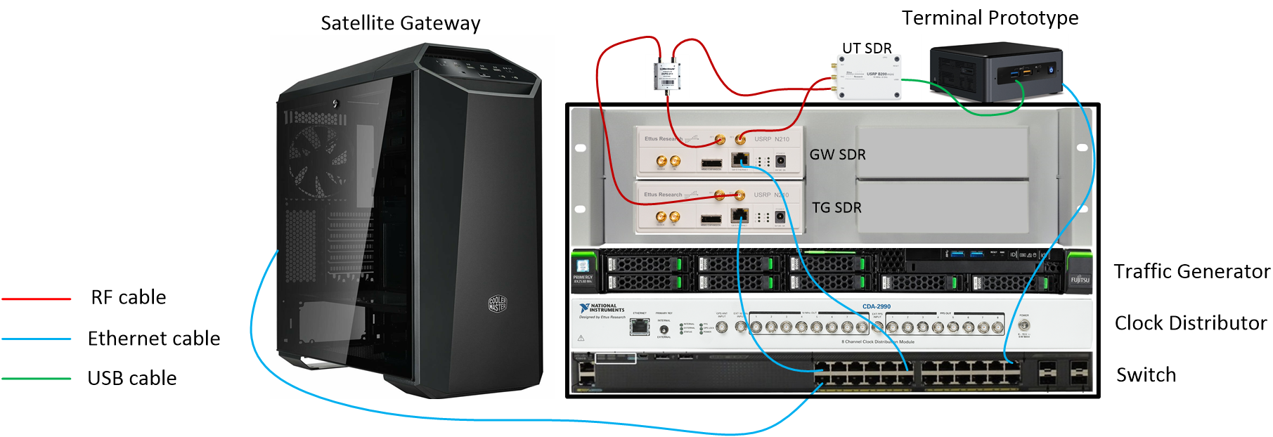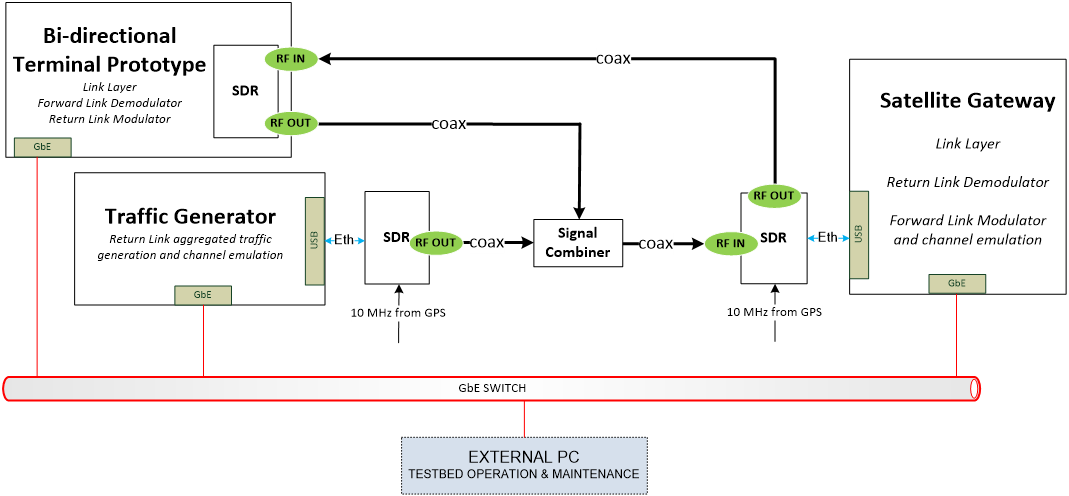 The testbed is based on SDR technology, allowing SW implementation of all the relevant modules. The architecture is provided below.