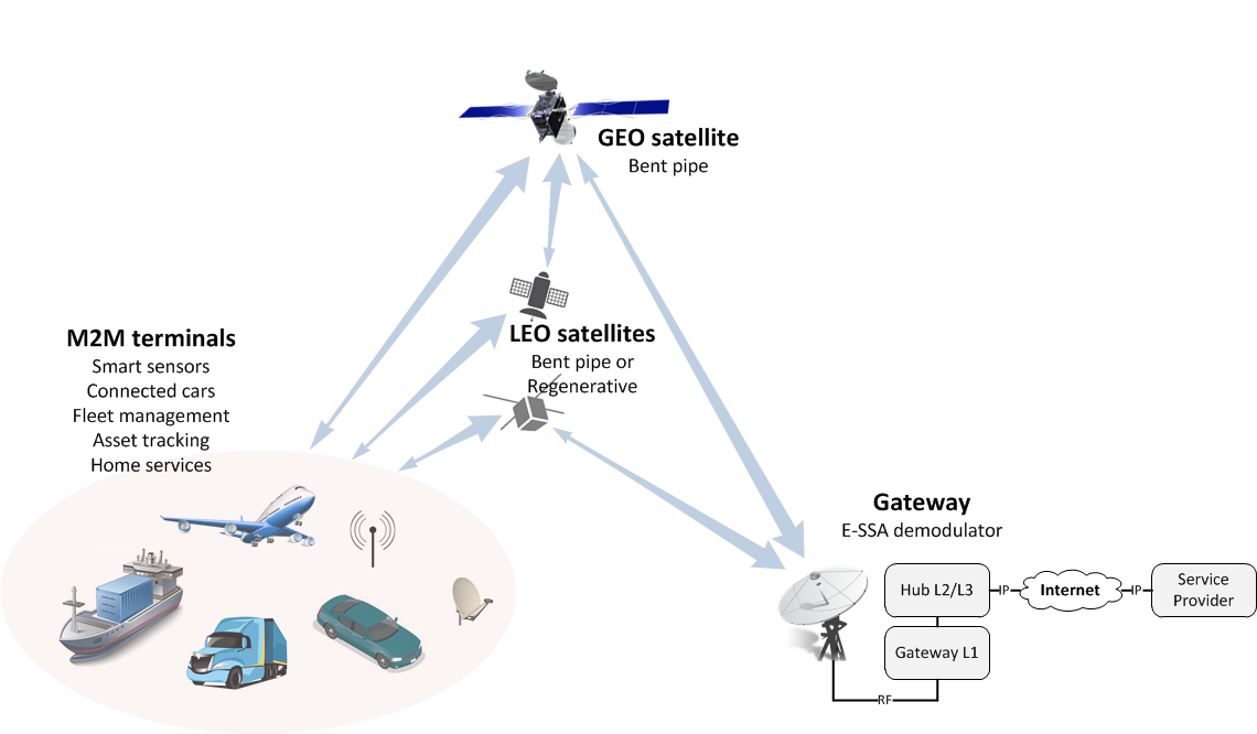 The gateway implements both a E-SSA-based demodulator (return link) in charge of receiving messages from a population of terminals and a transmitter able to send data to terminals through the ad-hoc forward link air interface.