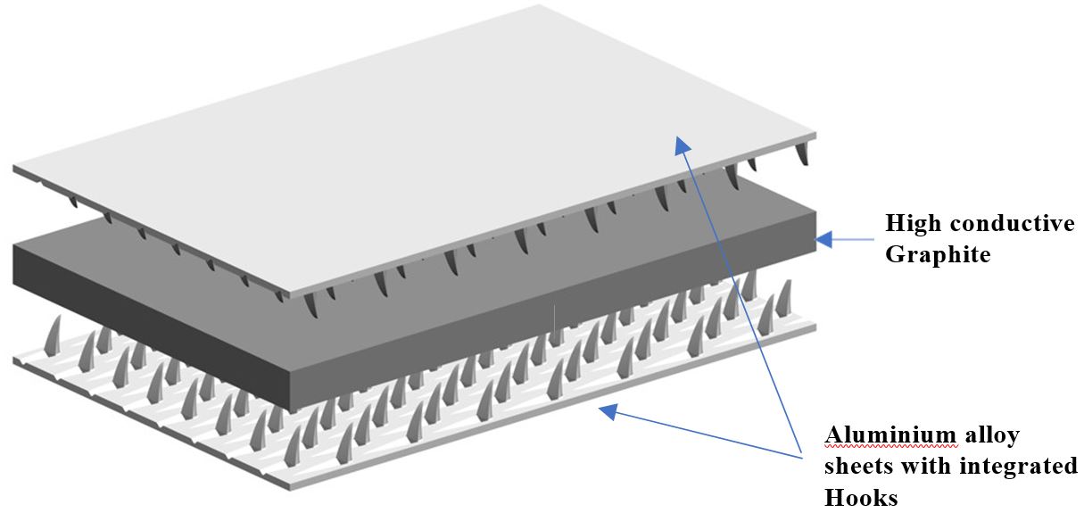 The structure consists of a high-conductive graphite layer, which is sandwiched between two aluminum alloy sheets. The latter have integrated hooks, which penetrate into the high-conductive layer, in order to increase the mechanical strength and the out- of-plane thermal conductivity of the compound.