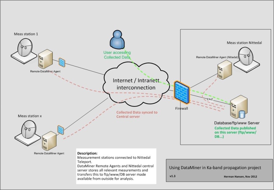 The propagation data have been measured using the satellite Ka-Sat at 9.1° E and the telecom data collected using Thor 7 at 1° W. The measurement network of the stations was set up with a 24/7 surveillance capability.