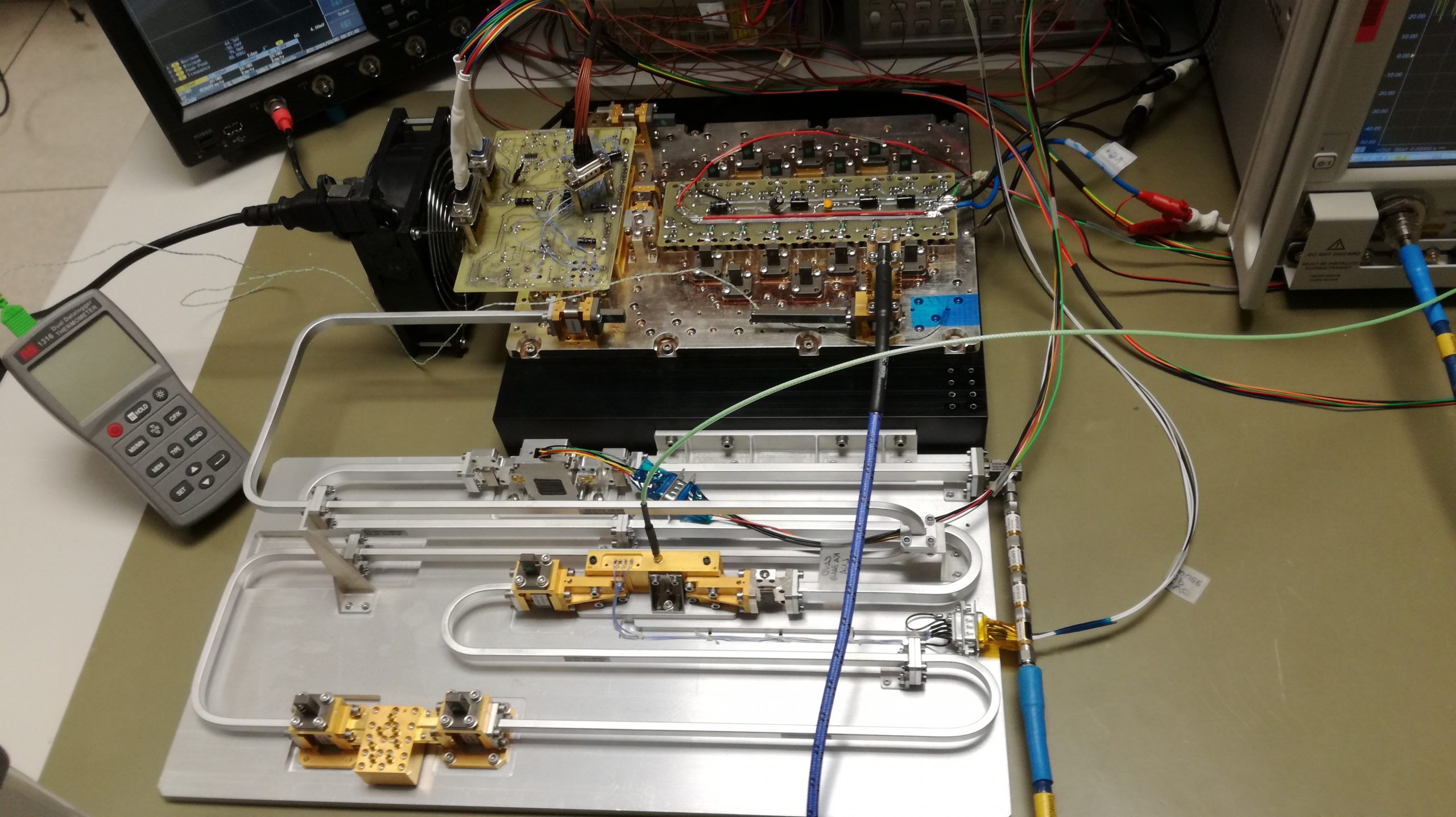 For the SSPA, two breadboard versions have been developed: the first one using high power MMICs designed and manufactured ad hoc, the second one using COTS devices recently developed by OMMIC.
