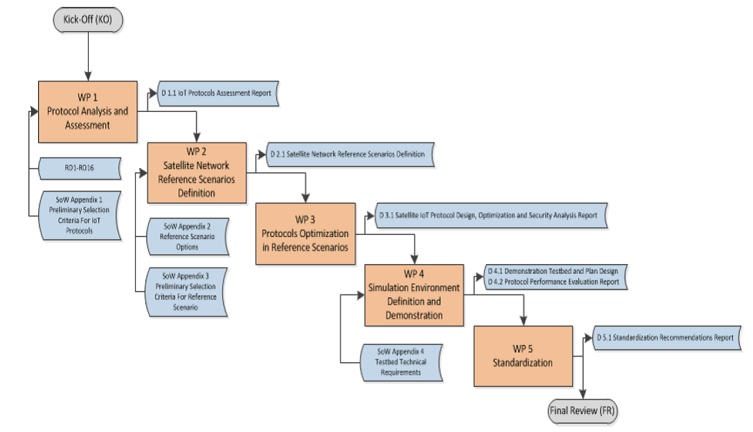 - To demonstrate, via implementations in a network testbed, the enhanced performance of integration procedures proposed for the selected M2M/IoT protocols in the selected reference M2M/IoT satellite network scenarios.
