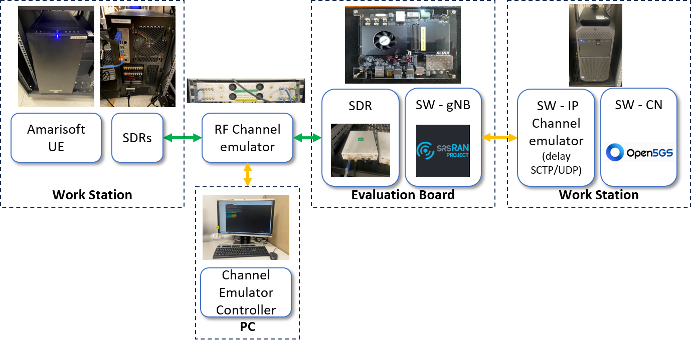 At the end of June 2025, Phase 1 was successfully completed. The main result of Phase 1 was the implementation of the E2E testbed, which integrates all the functionality of a 3GPP 5G NTN gNodeB integrated into a digital satellite payload. The actual testbed is shown in the following image.