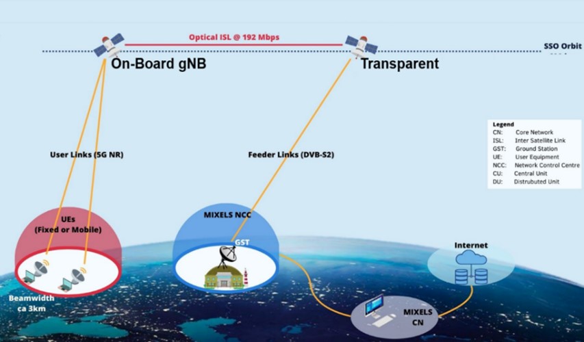 The main innovation introduced by MIXELS Project lies in integrating part or all of the gNB architecture on-board a regenerative satellite. The demonstration activity is supported by the availability of two already in orbit satellites flying at 600 km of altitude in sun-synchronous orbit, interconnected together via optical link (PathFinder GEN2 by Kepler Communications). Thanks to this capability several gNB configuration can be set-up and experimented as the one that embed the gNB on-board first satellite using the second one transparent to be a relay (see figure).