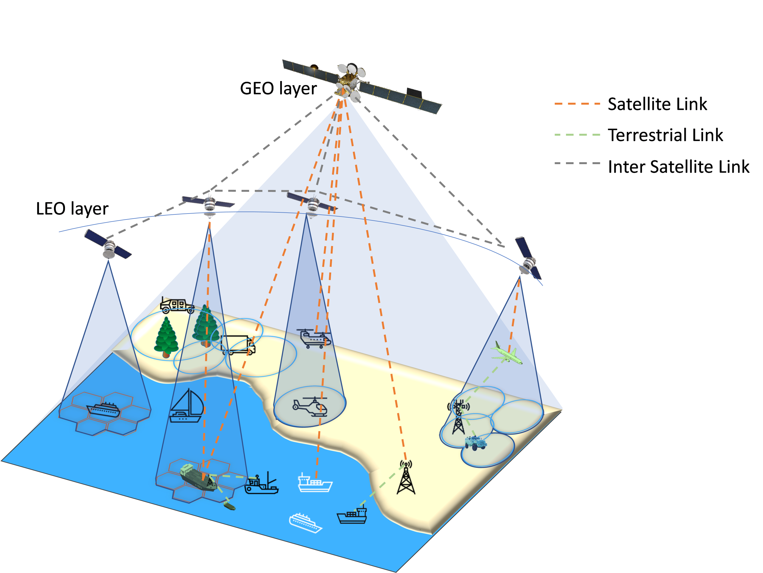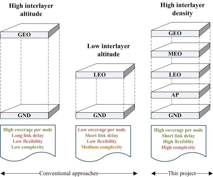 The project defines the architecture for a system that implements a multi-layered satellite scenario (see figure above) consisting of globally spread, heterogeneous user terminals capable of connecting to multiple available networks with heterogenous QoS requirements including, e.g., ultra-high availability deterministic broadband connections. The user terminals shall be able to communicate with multiple satellites simultaneously or seamlessly switching between satellites. The satellite layers are tightly integrated with joint orchestration and resource management for achieving the needed efficiency.