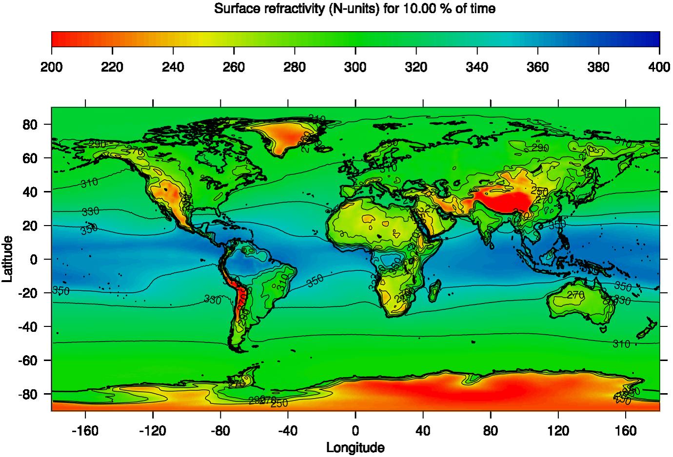 Figure 4: World map of surface refractivity quantile corresponding to 10% of time
