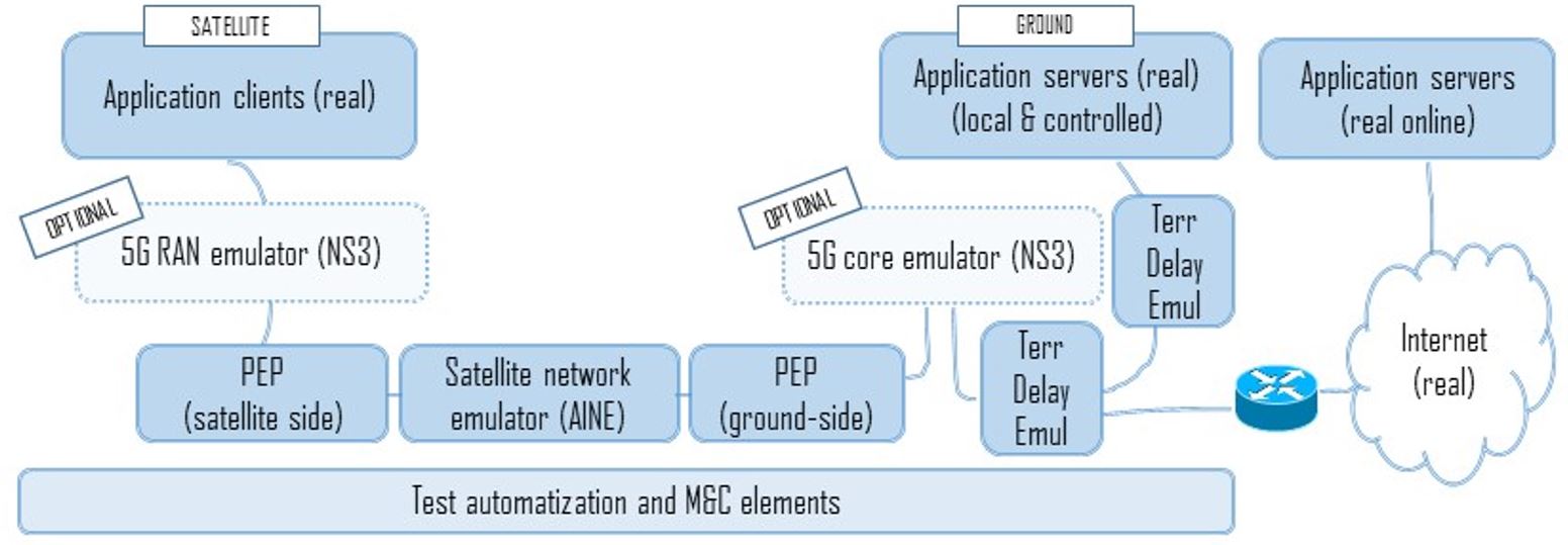 This test bed features two emulators: a satellite emulator (based on AINE tool [Link AINE BROCHURE], implementing bandwidth on demand (BoD) assignment protocols and applying satellite delays) and an optional 5G backhaul emulator. Connected to the emulators, we have commercial Performance Enhancement Proxies appliances (performing TCP acceleration and GTP tunnelling when needed), as used in most satellite systems, and, finally, the application clients and servers in real and locally controlled scenarios. These clients / server run the existing QUIC implementations.