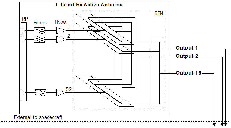 The receive antenna of the base solution is a full active antenna that generates 16 beams with 52 radiating elements. A view of the active antenna functional block diagram is following figure. It is composed of