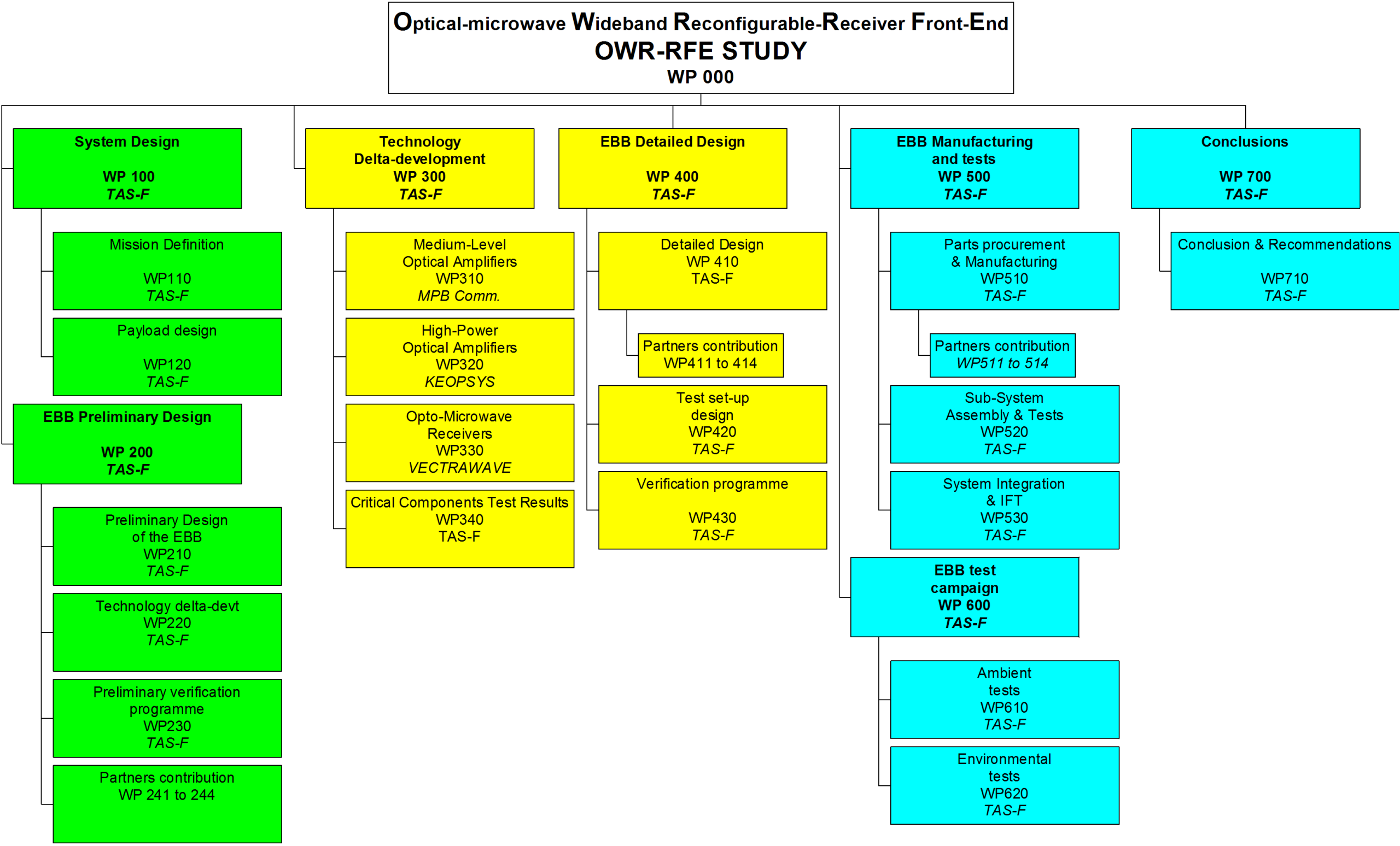 The aim of the study is to design, manufacture and test an EBB (Elegant BreadBoard) of an opto-microwave wideband reconfigurable receiver front-end (OWR-RFE) for future broadband telecom payloads.
