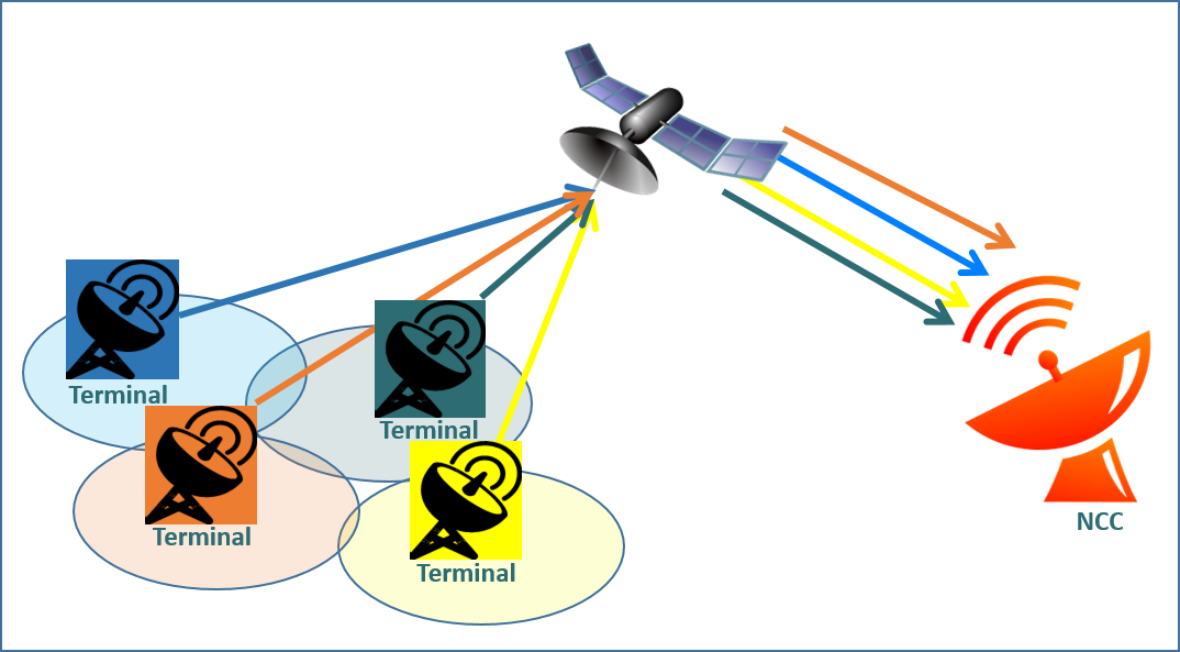 The DA system is a Multi User Detection (MUD) scheme employing spatial Minimum Mean Square Error Successive Interference Cancellation (MMSE SIC). In such scheme all terminals transmit on the same frequency band. The signal transmitted by each of the terminals is picked up by the satellite’s multiple antenna beams. Such setup can be seen as a distributed Multiple Input-Multiple Output (MIMO) system. In order to recover the signals of all terminals, the receiver applies a spatial MMSE-SIC algorithm on the signals received on the different beams. The system and the MUD algorithm are exemplified in Figure 2 below.