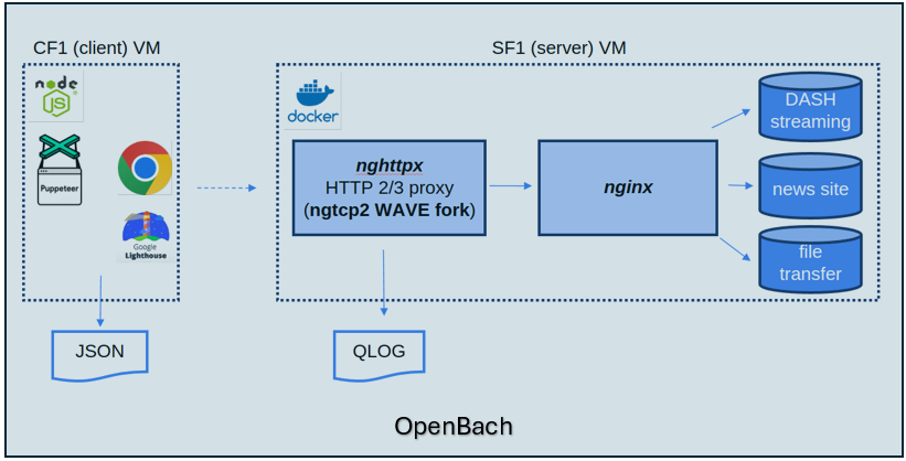 Some of the Virtual Machines deployed within the testbed contain real and emulated clients and servers, deployed in different containers and running in different Operating Systems, on top of which the developed QUIC congestion control can be enabled using real services and Web Browsers (i.e., Chrome). Furthermore, a realistic model of the transport network including complex network elements (e.g., CoDel buffers) and SatCom emulation is considered (e.g. OpenSand), including handovers, between clients and servers. Finally, configuration, execution and tracing of experiments for the testbed, KPI extraction and real-time monitoring capabilities (Management and Orchestration) are performed via OpenBach.