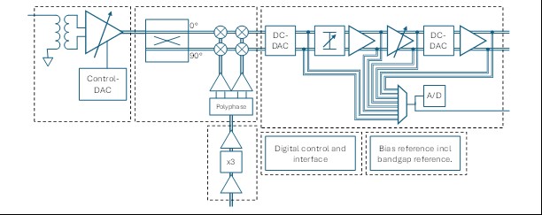 The main blocks are RF balun and VGA, followed by a Mixer, and then a baseband circuitry handling amplitude control, amplification and DC-offset compensation.