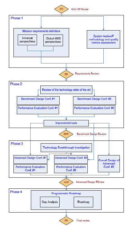 - Perform a review of state of the art technologies based on current roadmaps (institutional and industrial plans or commercial initiatives) and extrapolate the available technologies in the 2025 timeframe covering aspects related to satellite platforms, launchers, satellite antenna and repeater technologies, air interface, terminal and ground infrastructure