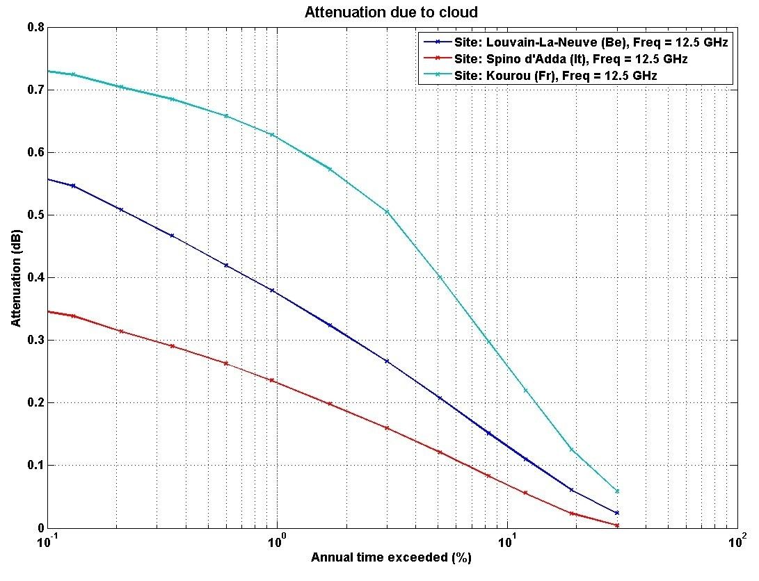 Figure 2: CCDF of attenuation due to clouds for various sites at 12.5 GHz