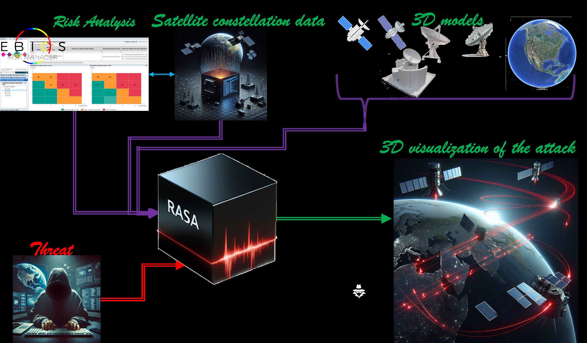 The objective is to provide to various stakeholders, amongst which decision makers, the result of security risk scenario triggering and the impacts on the system in a visual manner. This 3D visualisation of the risk and of its impact should provide a better understanding of risk and situational awareness. It is thus a concrete operational tool for decision-making process. The final purpose is to improve the understanding of security risk profiles and potential impacts on a satellite constellation, and to improve the protection of such a system.