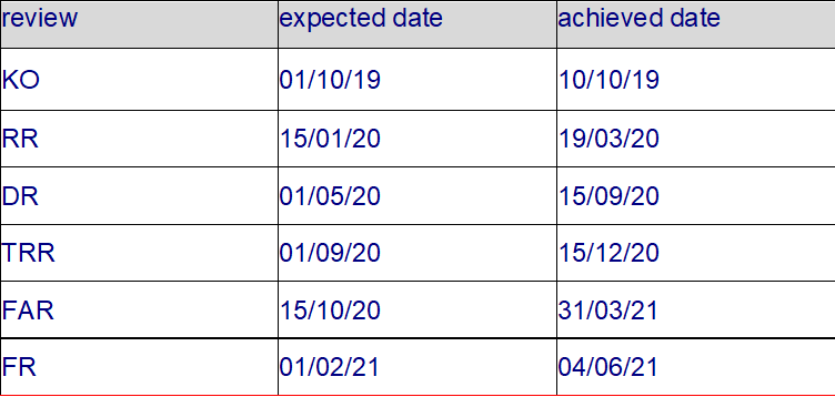 All the expected project reviews have been completed. Due to an unexpected sanitary crisis, all have been performed remotely. The final demonstration is replaced by a digital event including a professional-made video of the concept. A shift of the planning was observed and managed to be limited to 4 months at the end of the project. Minutes have been provided by Thales Alenia Space for each meeting. The table below summarizes the reviews as performed.