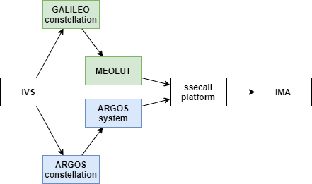 The system makes use of the Galileo/SAR and the ARGOS system to transmit to a public service access point. The diagram below shows the main components of the system.