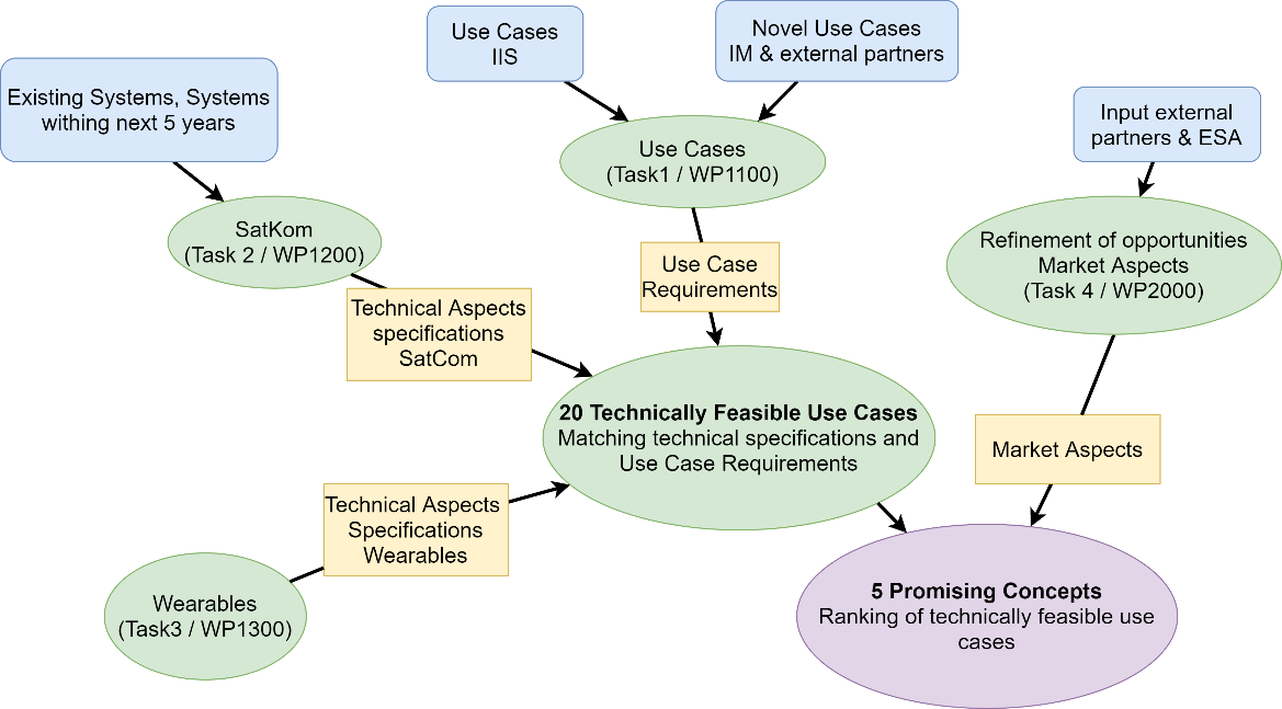 Over 65 possible SatWear use cases were envisioned. In a second step and with the help of experts from the wearables and the satcom industries, these use-cases were elaborated, rated and finally, highlights for the PoC demonstrators were selected.