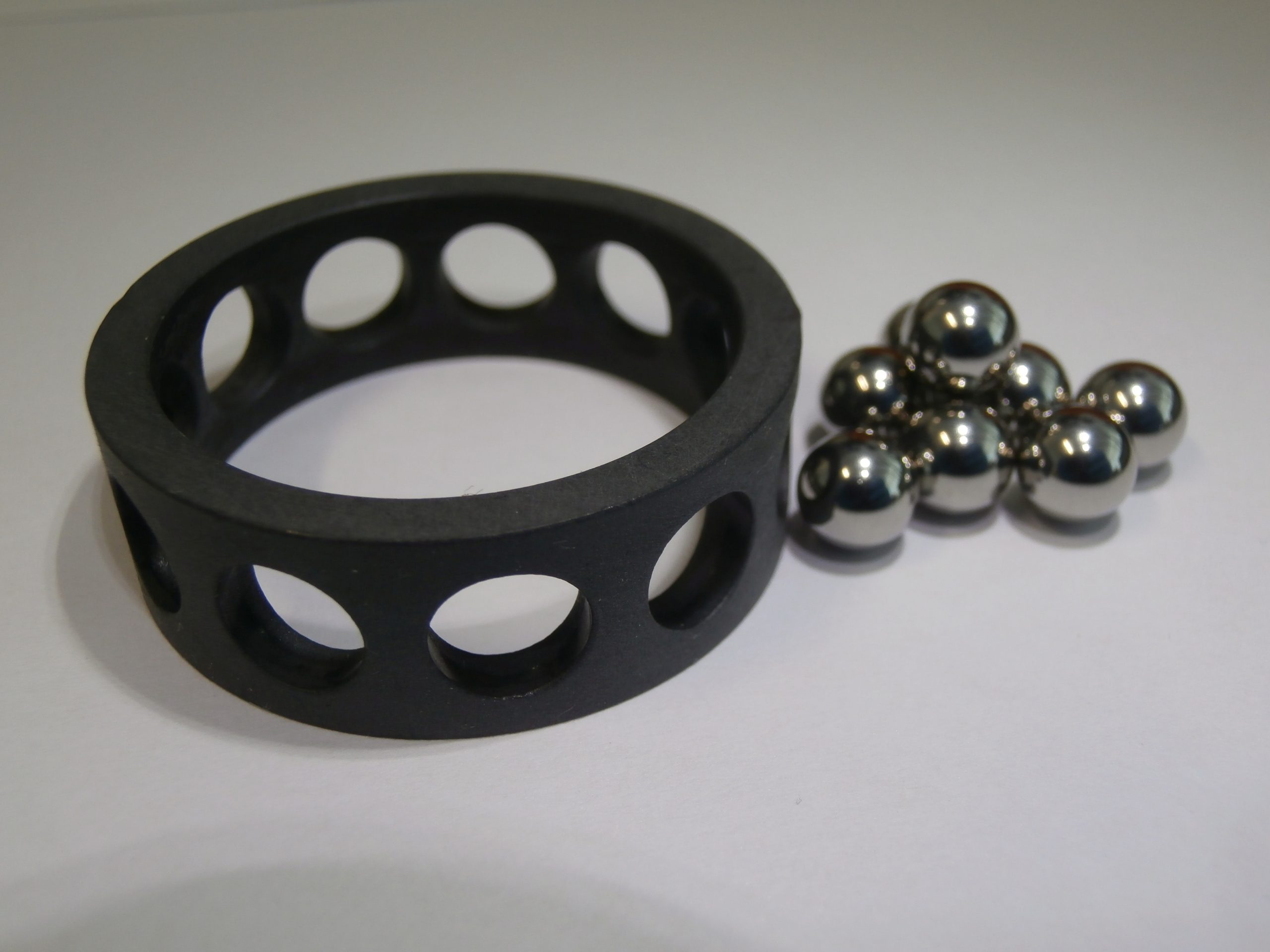 The key challenge is to identify a proper composition for the cage material, so that enough material is transferred (to enable good lubrication), that not too much is transferred (to early wear of the cage), and that finally the transfer layers is smooth. Some more material specific properties are e.g. no shrinkage, no outgassing.