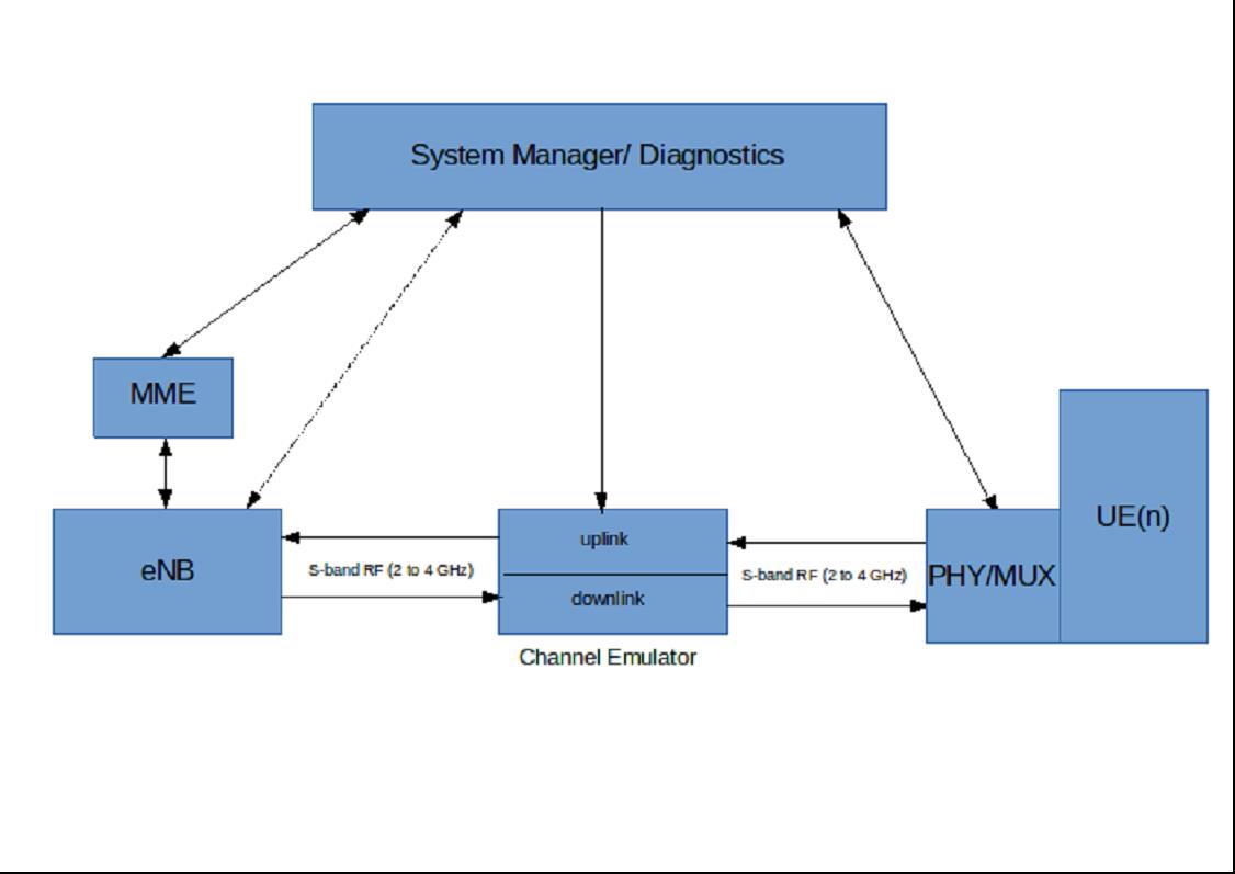 The test bench system consists of 5 sub-systems; an NTN NB-IoT eNodeB (base station), multiple NTN NB-IoT UEs (user terminals), a minimal Core Network (CN), a satellite channel emulator, and a system manager/ diagnostics viewer.
