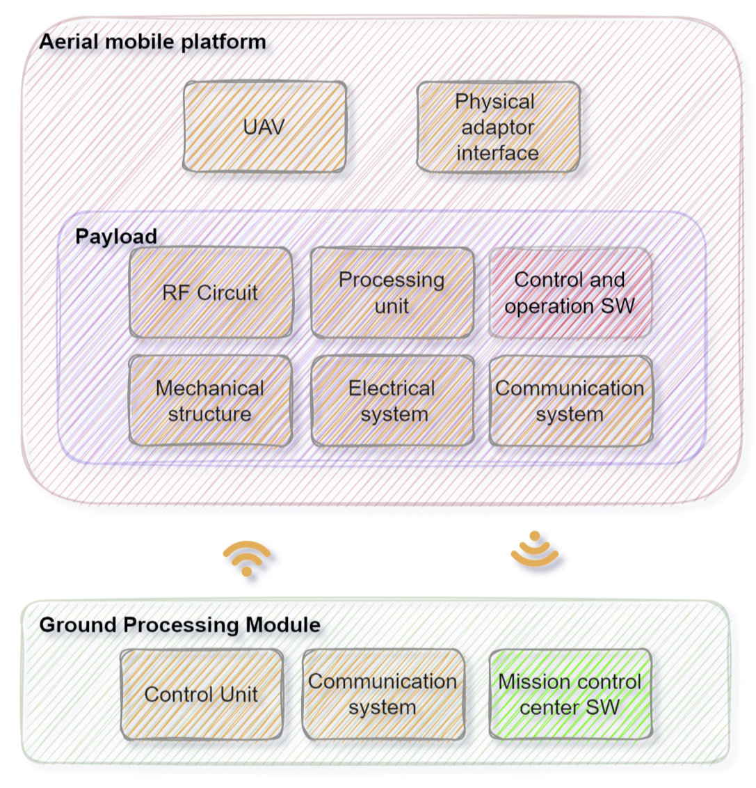 The drone-based geolocation system is composed of two main hardware parts, the Aerial Mobile Platform for measurements and the Ground Processing Module. The software running the system is also divided into two main parts, the control software which is part of the onboard control of the drone and payload and the mission and control software running on the ground processing module allowing the user to operate the system.
