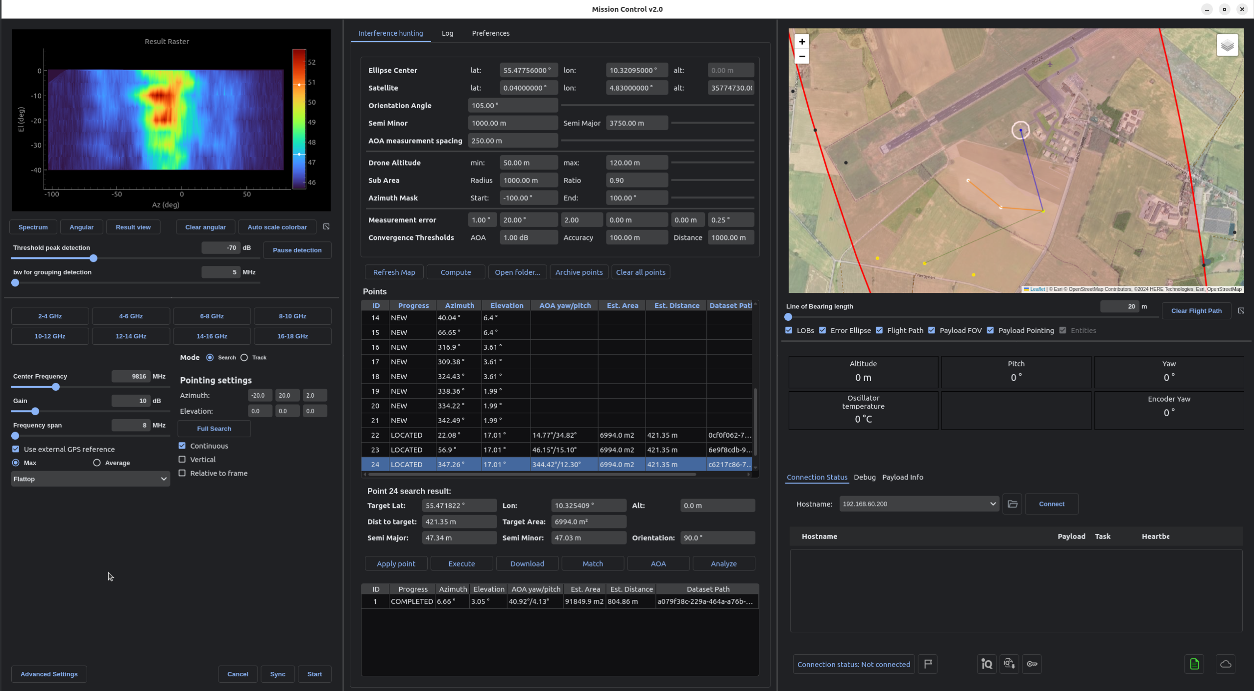 Geolocating interference presents several challenges, including the large size of the search area, which complicates the identification of the interferer’s exact location. Additionally, the assumption that the interferer’s antenna is directional rather than omnidirectional limits the signal detectability and affects the search algorithm. Regulatory restrictions also pose a significant challenge, as flight operations must adhere to Visual Line of Sight (VLOS) rather than Beyond Visual Line of Sight (BVLOS), limiting the range and flexibility of the airborne platform used for geolocation.