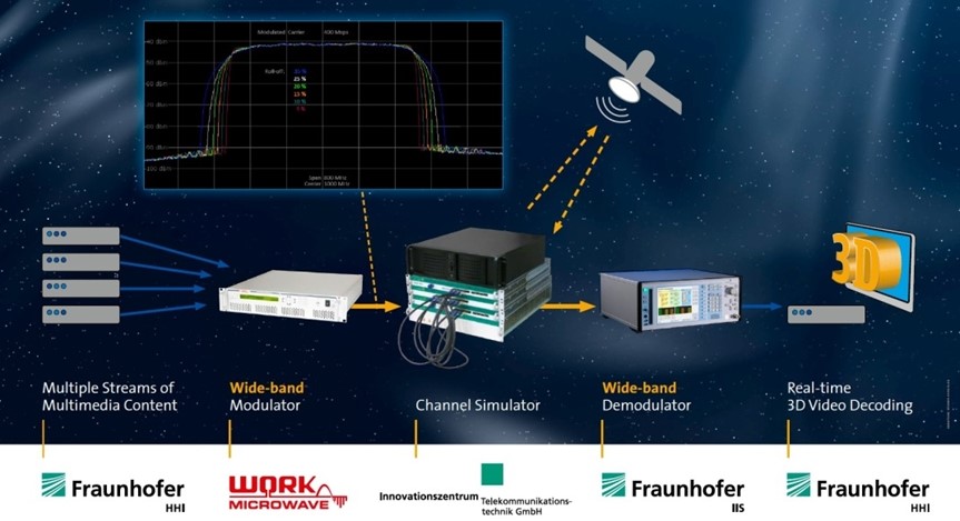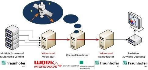 On the left hand side of the transmission chain, multiple video streams are cyclically played out to the wideband modulator via Ethernet. These streams are multiplexed into one single-carrier wideband RF signal. The channel simulator manipulates the wideband signal according to the configured satellite impairments and forwards it to the wideband demodulator. Synchronization, demodulation, and decoding are performed. Selected video streams (from the whole multiplex) are provided to the real-time 3D video decoder for rendering by a TV-set.