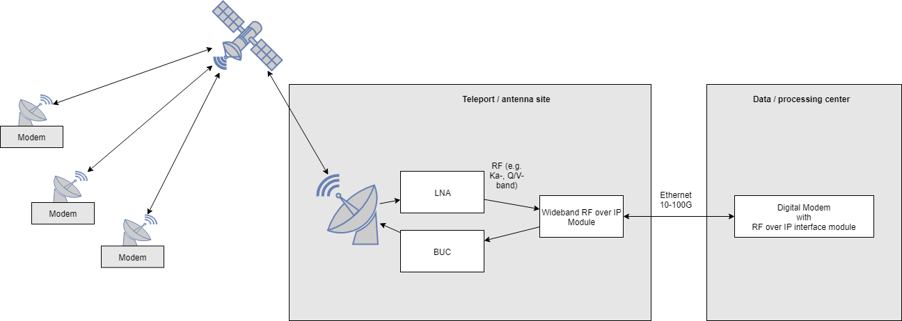 The main use case scenario is for use with VSAT systems where the wideband RF over IP module is placed at the antenna sites and typically communicated with digital modems with RF over IP interfaces via a high-speed fiber connection as shown in the figure below.